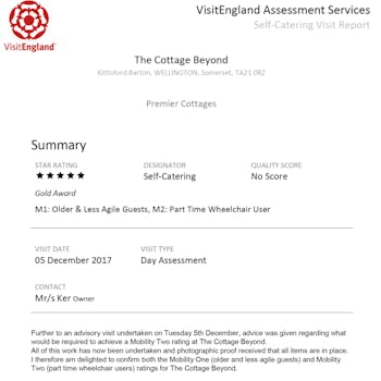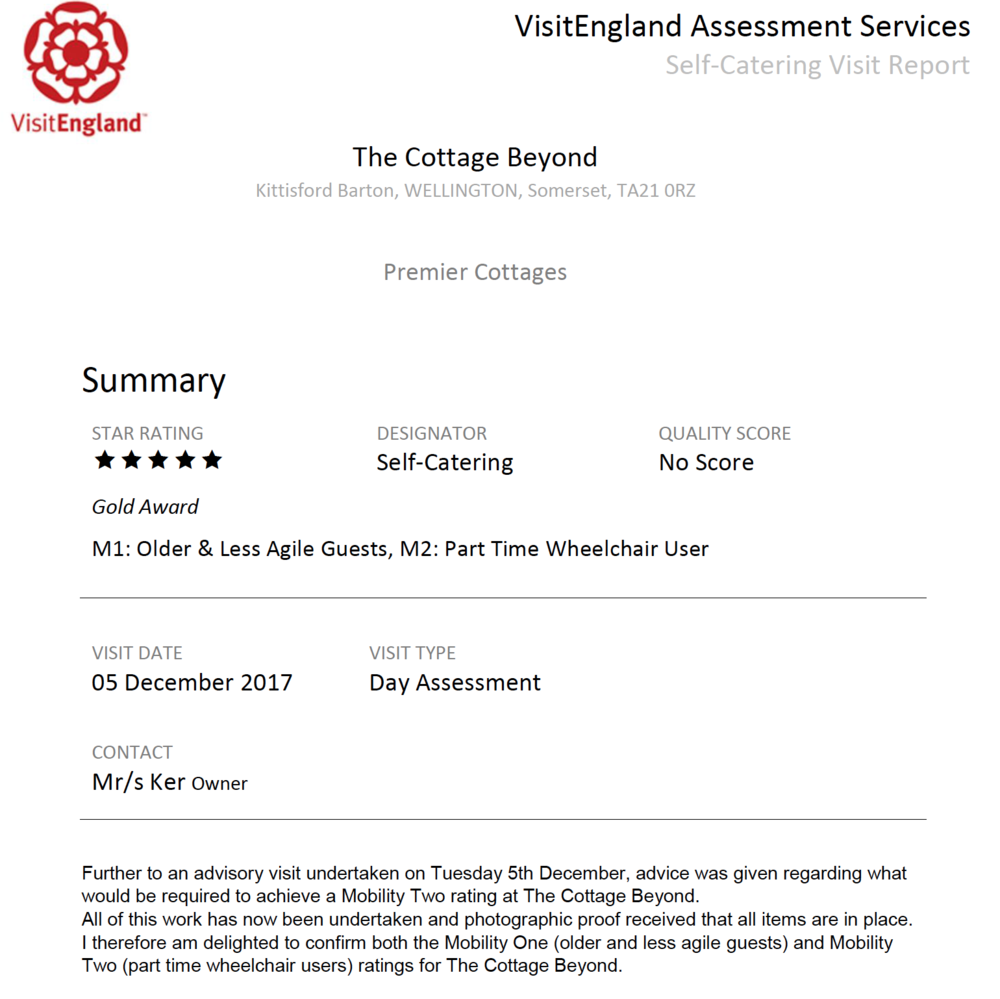 We are delighted to announce that after great advise from VisitEngland, careful planning and alterations in early January to the ground floor en-suite shower room The Cottage Beyond has achieved the M1 and M2 awards in the National Accessibility Scheme.