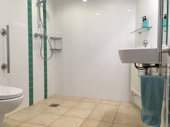 Doorhandles on the wardrobe are now easy grip handles rather than fiddly knobs, a bell to summons help is available, the wash hand basin has been changed so that wheelchair users can get their chairs under, the shower now sports easy lever controls like the washbasin, there are strategically placed tasteful grab rails, mirrors that all can see in and chairs with arms to easily get out of. Well we've done it and hopefully we have made TCB easier for all.