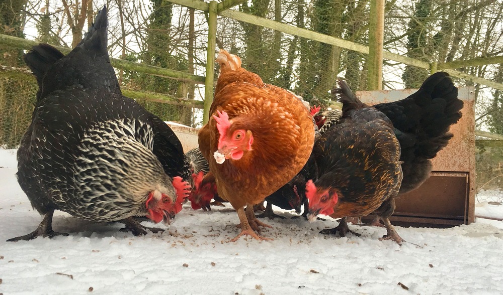 The chickens were happily living out in the Orchard until Avian Flu returned to the UK and all poultry keepers were required to keep them under cover away from the wild birds. Once the threat had passed and they were allowed back out, we let them roam free again. They're happy whatever the weather as they can always retreat into their shed. But now........they're back behind the wire again as there is a very hungry vixen fox with cubs living near by and she's rather partial to poulty. Having lost several chickens over the last month, we've decided to keep them in until we've put up better defences.